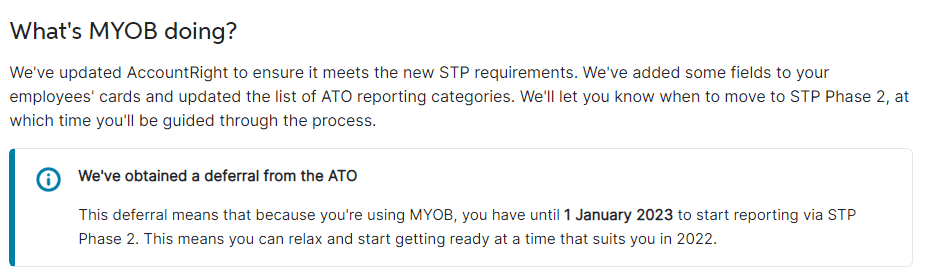 The deadline to be ready for STP 2 is 01 March 2022. However, MYOB have announced that they have secured a deferral